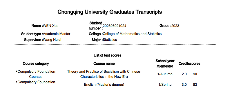 Course Category Course Name School Year / Semester Credits Score