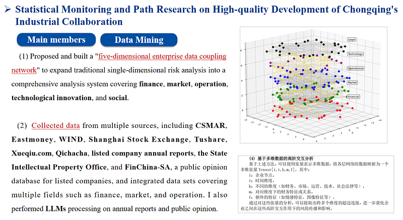I participated in a project with the Chongqing Bureau of Statistics, applying LLMs to economic data integration by unifying multi-source financial, textual, and sentiment features into a tensor representation, and built a five-dimensional enterprise data coupling network