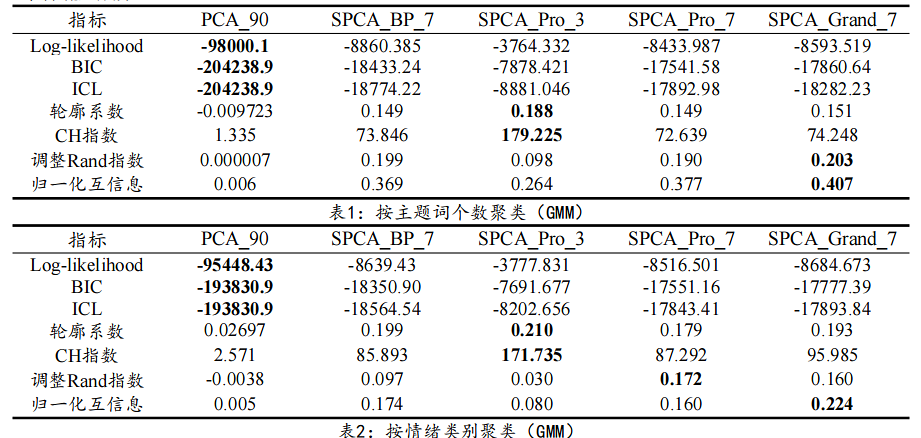 When clustering keywords, SPCA_Pro_3 achieves the highest silhouette coefficient of 0.188, indicating a clear clustering structure. SPCA_Pro_3 achieved the highest CH index (the ratio of within-class variance to between-class variance) at 179.225, indicating strong clustering results. A higher adjusted Rand index is preferred, as it measures the consistency between clustering results and the true classifications. SPCA_Pro_7 achieved the highest Rand index at 0.203, and SPCA_Grand_7 achieved the highest NMI at 0.407, indicating relatively consistent classification information in their clustering results. When targeting emotion classification, similar results were achieved, with the exception of SPCA_Pro_3, which achieved the highest Rand index at 0.197.